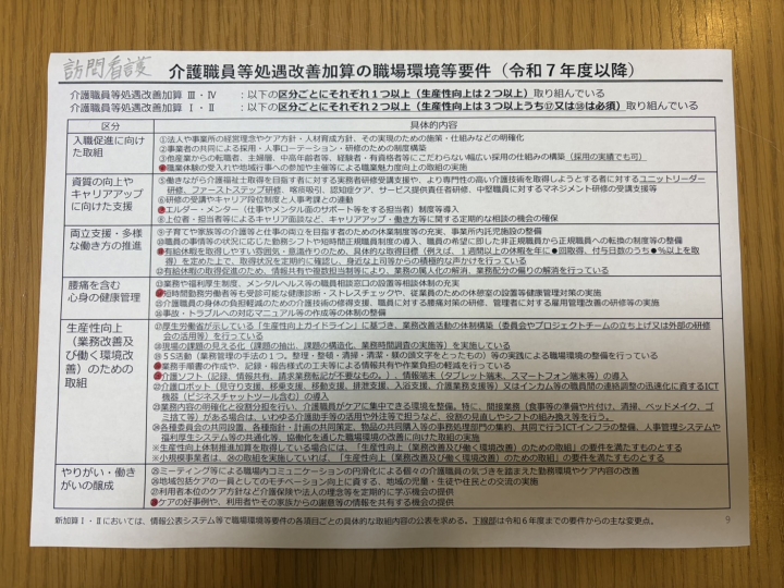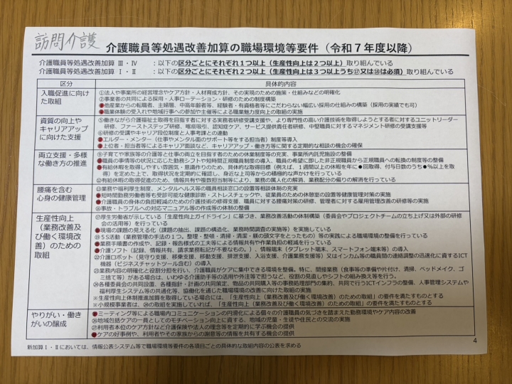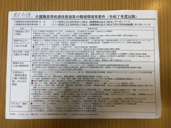 訪問介護では、2024.4月より介護職員等処遇改善加算(新加算)Ⅰを算定させていただいております。